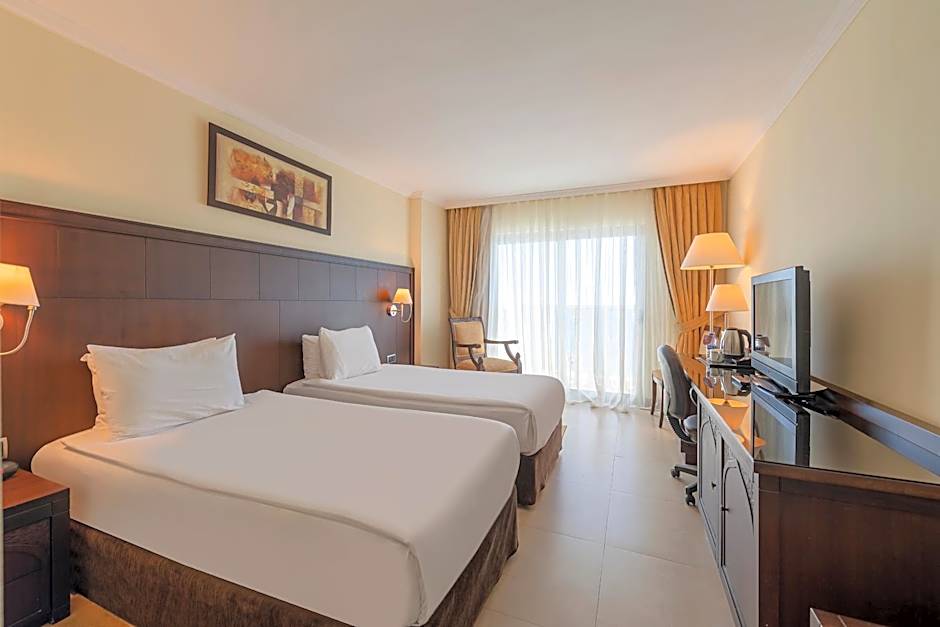 32 Sqm Standard Room With Front Mediterranean Sea View, 32inch LCD TV and a Bathroom with Bathtub.